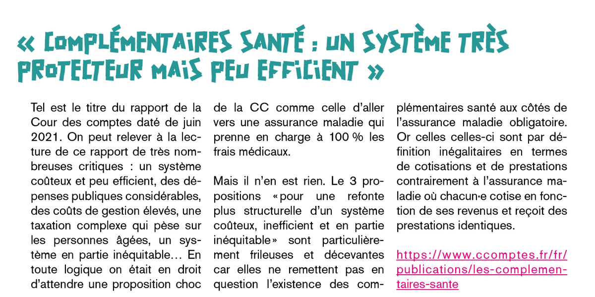 Tel est le titre du rapport de la Cour des comptes daté de juin 2021. On peut relever à la lecture de ce rapport de très nombreuses critiques : un système coûteux et peu efficient, des dépenses publiques considérables, des coûts de gestion élevés, une taxation complexe qui pèse sur les personnes âgées, un système en partie inéquitable… En toute logique on était en droit d’attendre une proposition choc de la CC comme celle d’aller vers une assurance maladie qui prenne en charge à 100 % les frais médicaux.