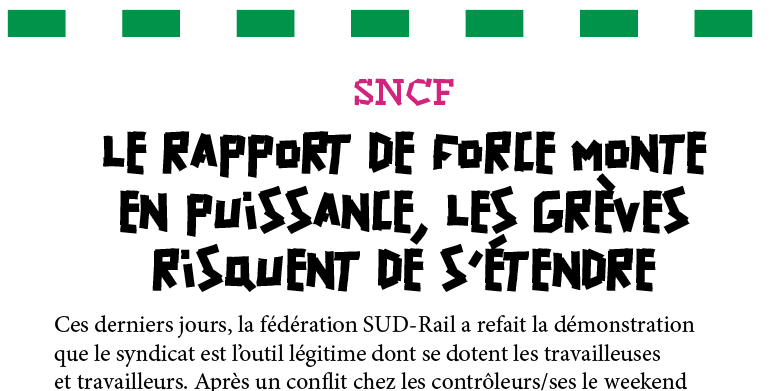 La direction SNCF – soutenue par le gouvernement – a fait le choix de l’affrontement social. Elle refuse de céder aux revendications de ces deux catégories de personnel par peur que cela montre la voie à d’autres professions à la SNCF. C’est un calcul très dangereux car au lieu d’éteindre des foyers de contestation, cela risque d’engendrer un embrasement général dans le ferroviaire ces prochaines semaines. En parallèle de ces mobilisations, la fédération SUD-Rail continue à construire un rapport de forces et des perspectives « tou·tes cheminot·es » … malgré le refus des fédérations cheminotes CGT – UNSA – CFDT.