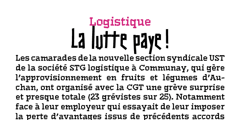 Les camarades de la nouvelle section syndicale UST de la société STG logistique à Communay, qui gère l’approvisionnement en fruits et légumes d’Auchan, ont organisé avec la CGT une grève surprise et presque totale (23 grévistes sur 25). Notamment face à leur employeur qui essayait de leur imposer la perte d’avantages issus de précédents accords (représentant près de 350 euros par salarié), et pour l’augmentation de leur taux horaire. En grève de 9 h à 15 h et avec un piquet/barbecue où le passage de plusieurs camarades Sud/Solidaires en soutien a été très apprécié, ils ont obtenu 90 % de leurs revendications ! C’était la première grève dans cette société depuis 15 ans et une belle première victoire.