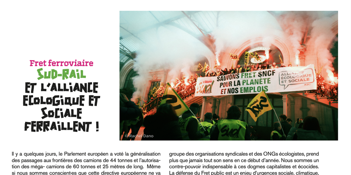 Le combat syndical et écologique mené depuis plusieurs mois avec la fédération SUD-Rail et l’Alliance Écologique et Sociale, qui regroupe des organisations syndicales et des ONGs écologistes, prend plus que jamais tout son sens en ce début d’année. Nous sommes un contre-pouvoir indispensable à ces dogmes capitalistes et écocides. La défense du Fret public est un enjeu d’urgences sociale, climatique, sanitaire, son développement est une opportunité pour engager la bifurcation de nos modèles de transports : saisissons-nous de cette campagne dans nos solidaires locaux, au sein des différents collectifs …
