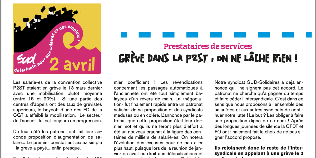Les salarié-es de la convention collective P2ST étaient en grève le 13 mars dernier avec une mobilisation plutôt moyenne (entre 15 et 20%). Si une partie des centres d’appels ont des taux de grévistes supérieurs, le boycott d’une des FD de la CGT a affaibli la mobilisation. Le secteur de l‘accueil, lui est toujours en progression.