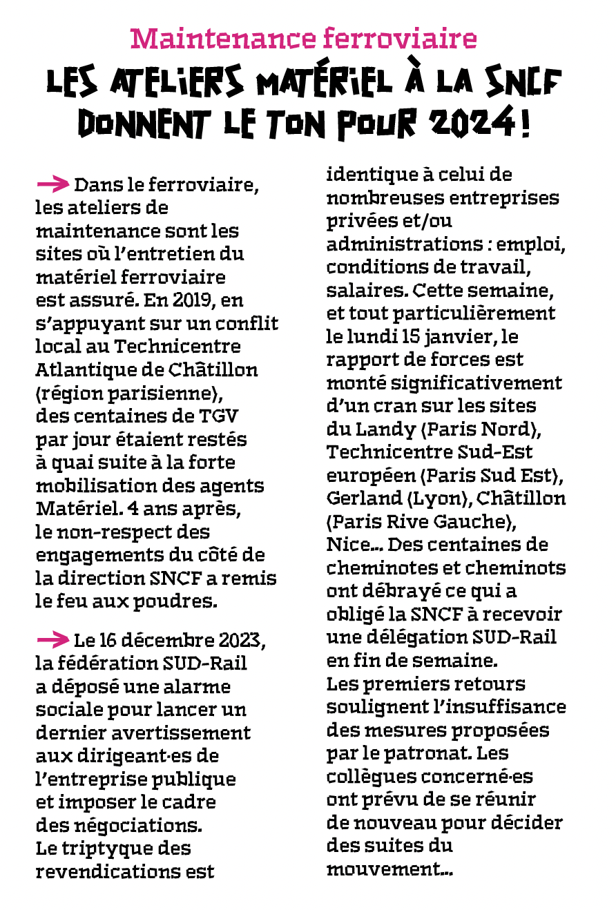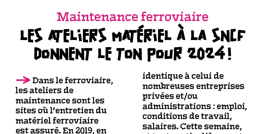 Dans le ferroviaire, les ateliers de maintenance sont les sites où l’entretien du matériel ferroviaire est assuré. En 2019, en s’appuyant sur un conflit local au Technicentre Atlantique de Châtillon (région parisienne), des centaines de TGV par jour étaient restés à quai suite à la forte mobilisation des agents Matériel. 4 ans après, le non-respect des engagements du côté de la direction SNCF a remis le feu aux poudres.