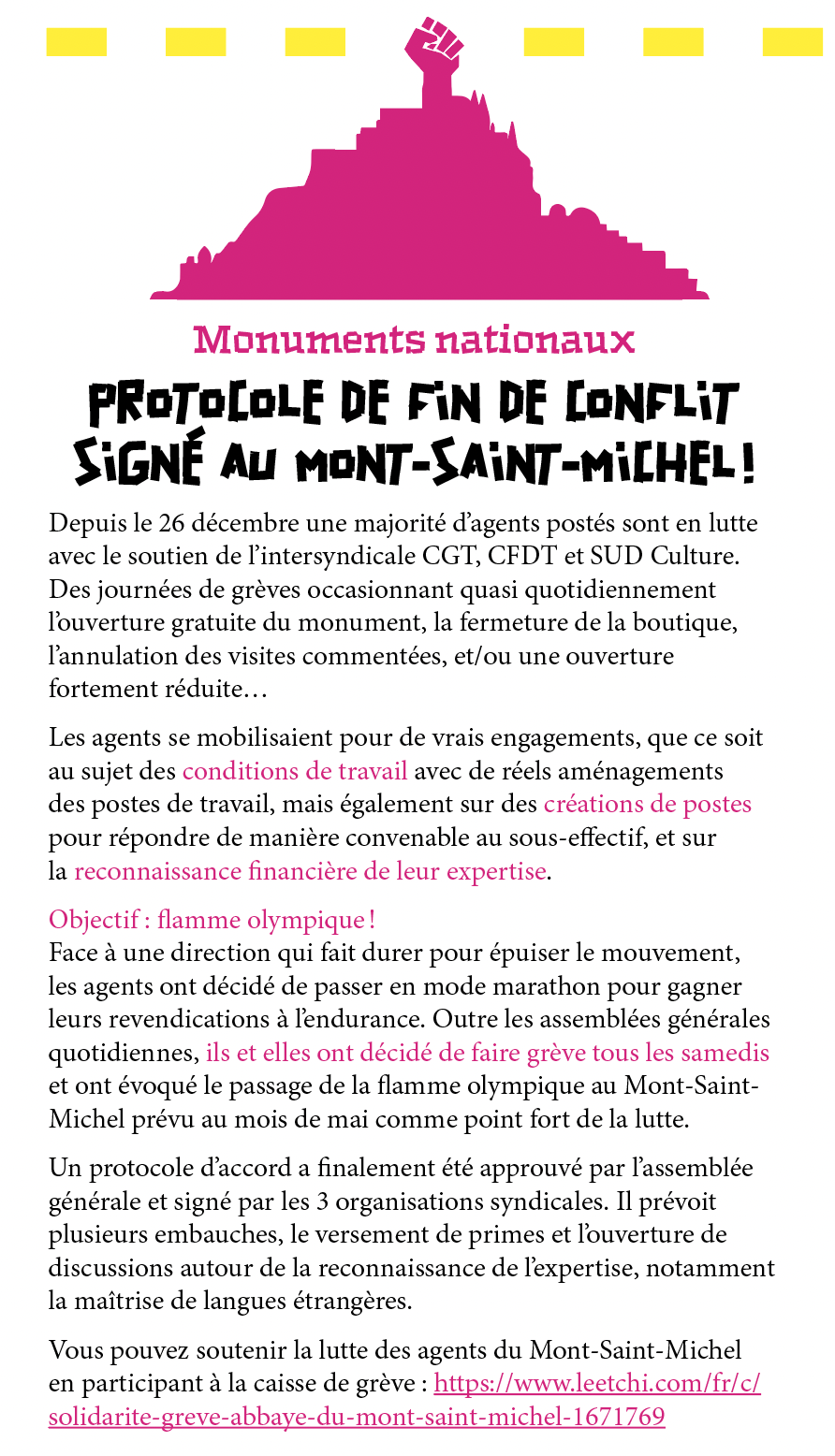 Vous pouvez soutenir la lutte des agents du Mont-Saint-Michel en participant à la caisse de grève : https://www.leetchi.com/fr/c/solidarite-greve-abbaye-du-mont-saint-michel-1671769