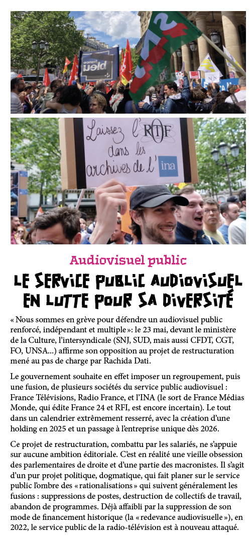 Ce projet de restructuration, combattu par les salariés, ne s’appuie sur aucune ambition éditoriale. C’est en réalité une vieille obsession des parlementaires de droite et d’une partie des macronistes. Il s’agit d’un pur projet politique, dogmatique, qui fait planer sur le service public l’ombre des « rationalisations » qui suivent généralement les fusions : suppressions de postes, destruction de collectifs de travail, abandon de programmes. Déjà affaibli par la suppression de son mode de financement historique (la « redevance audiovisuelle »), en 2022, le service public de la radio-télévision est à nouveau attaqué.