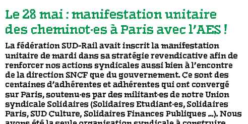 La fédération SUD-Rail avait inscrit la manifestation unitaire de mardi dans sa stratégie revendicative afin de renforcer nos actions syndicales aussi bien à l’encontre de la direction SNCF que du gouvernement. Ce sont des centaines d’adhérentes et adhérentes qui ont convergé sur Paris, soutenu·es par des militant·es de notre Union syndicale Solidaires (Solidaires Etudiant·es, Solidaires Paris, SUD Culture, Solidaires Finances Publiques …). Nous avons été la seule organisation syndicale à construire un cortège qui a réuni toutes les forces syndicales, écologiques et politiques qui nous soutiennent dans nos luttes sociales. Depuis le début de l’année, nous sommes à l’offensive dans le ferroviaire, nous engrangeons des avancées sociales … nous allons poursuivre cette dynamique en juin.