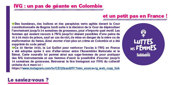 💚Ce 23 février 2022, la Loi Gaillot pour renforcer l’accès à l’IVG en France a été adoptée après 2 ans d’aller-retour entre l’Assemblée Nationale et le Sénat. Cette nouvelle loi permet ainsi aux sage-femmes de pour pratiquer des IVG instrumentale et aux femmes d’avoir la possibilité d’avorter jusqu’à 14 semaines de grossesse. Retrouvez le live Instagram sur l’IVG du collectif unitaire du 8 mars ici : https://www.instagram.com/tv/CZ7jOzaoLVF/?utm_source=ig_web_copy_link