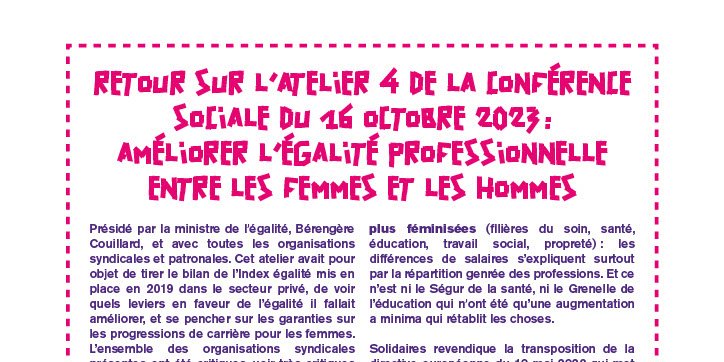 La synthèse faite par la Ministre de l’égalité à l’issue de l’atelier a été reprise par la 1ère Ministre en séance plénière...sauf la nécessité d’augmenter le SMIC et d’octroyer des points d’indice …
