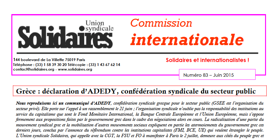 Grèce : déclaration d’ADEDY, confédération syndicale du secteur public